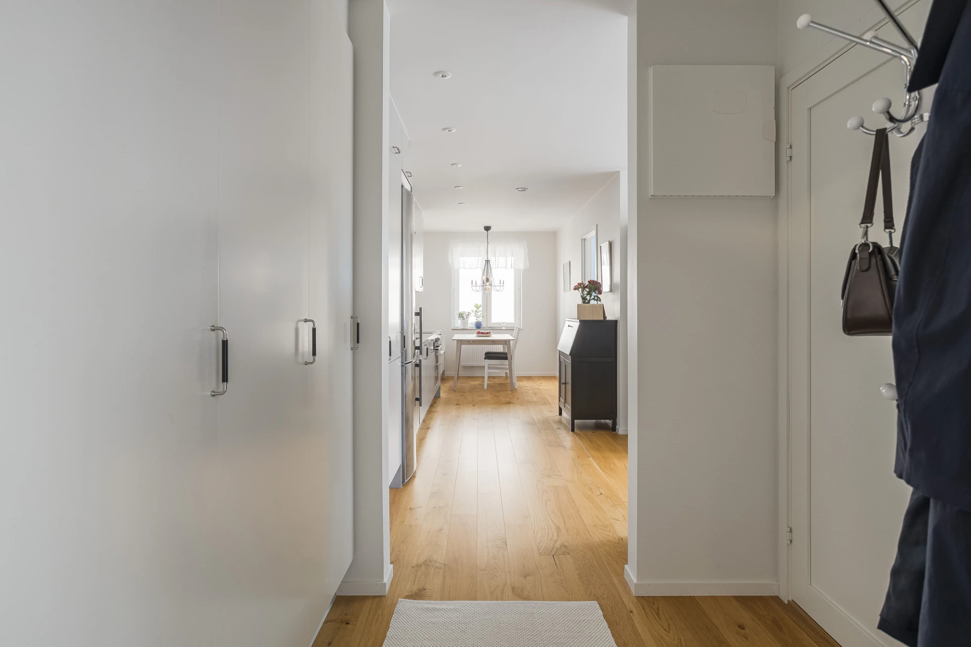 Välkomnande entré med avhängningsyta och bra förvaring i tre garderober. Fötterna vilar på vacker enstavig ekparkett som är genomgående i bostaden. Vidare in mot köket finns ytterligare förvaring i en garderob och ett städskåp.
