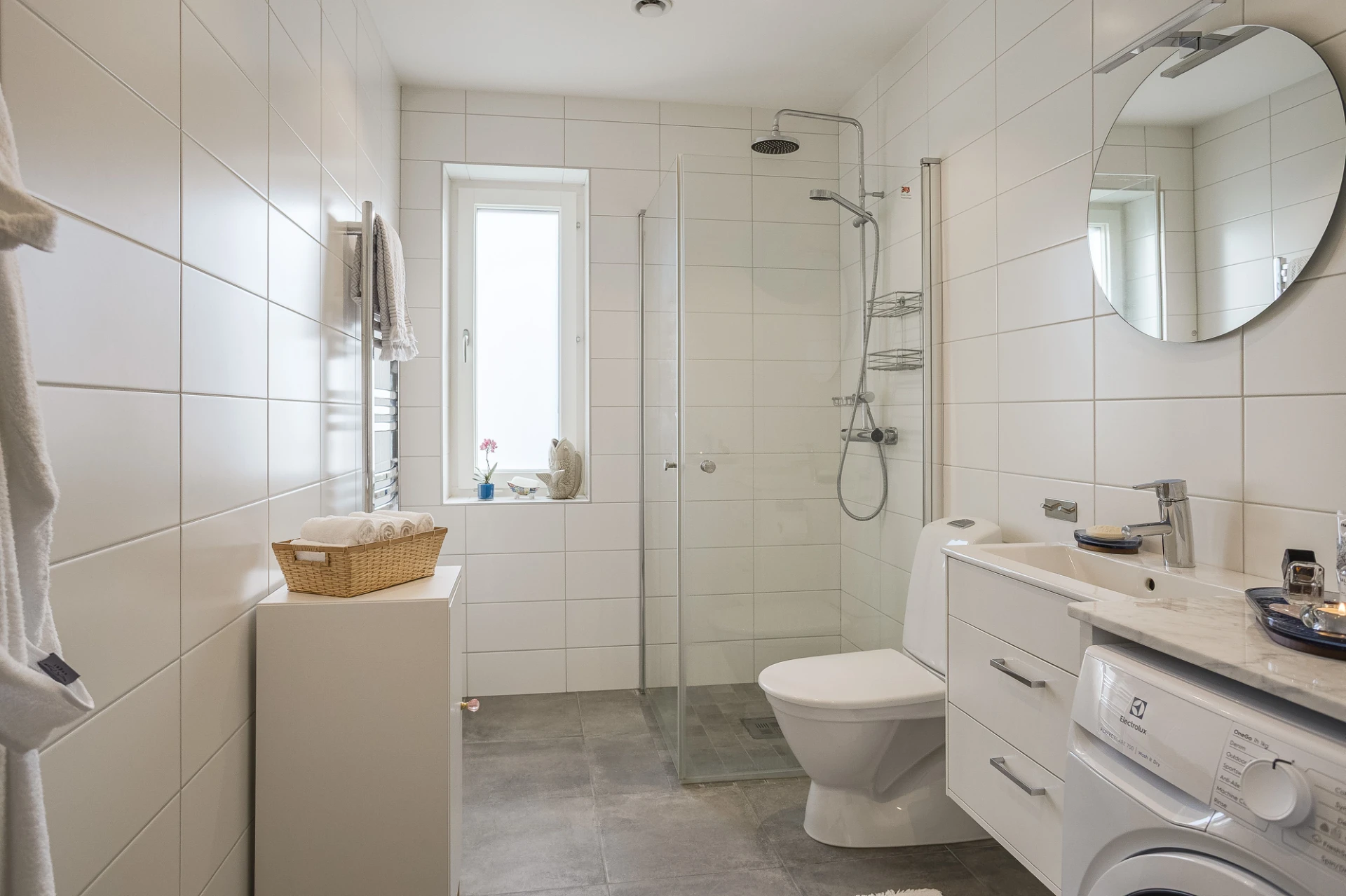 Mycket stilfullt, helkaklat badrum med golvvärme som är bekvämt utrustat med allt man önskar. Här finns wc, handfat med kommod, dusch med glasdörrar och takdusch, handdukstork, kombinerad tvättmaskin/torktumlare med arbetsyta av marmor samt fönster.