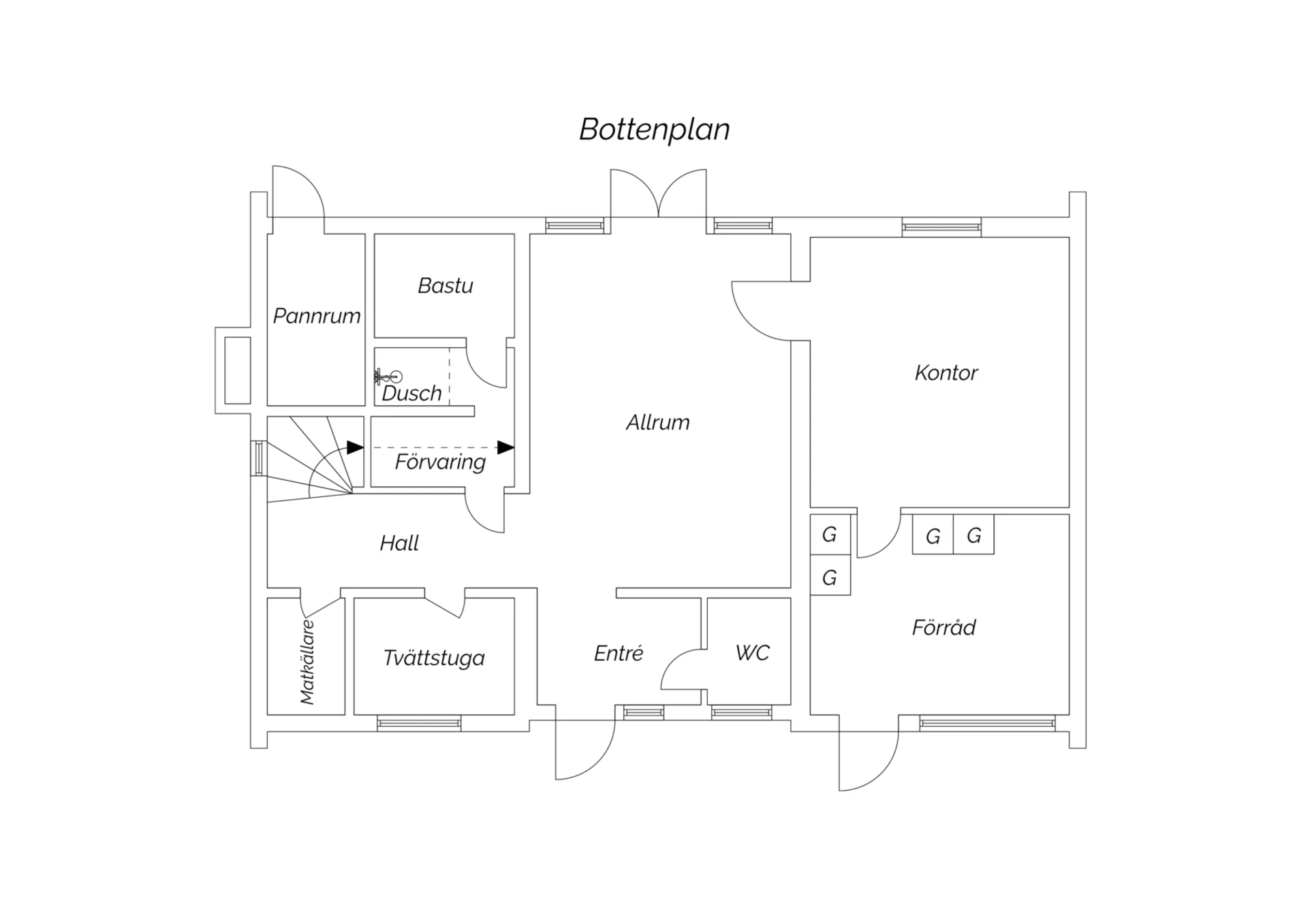 2005 - Duschutrymme nere byggt in trappan, handdukstork, kakel, element vid trappan