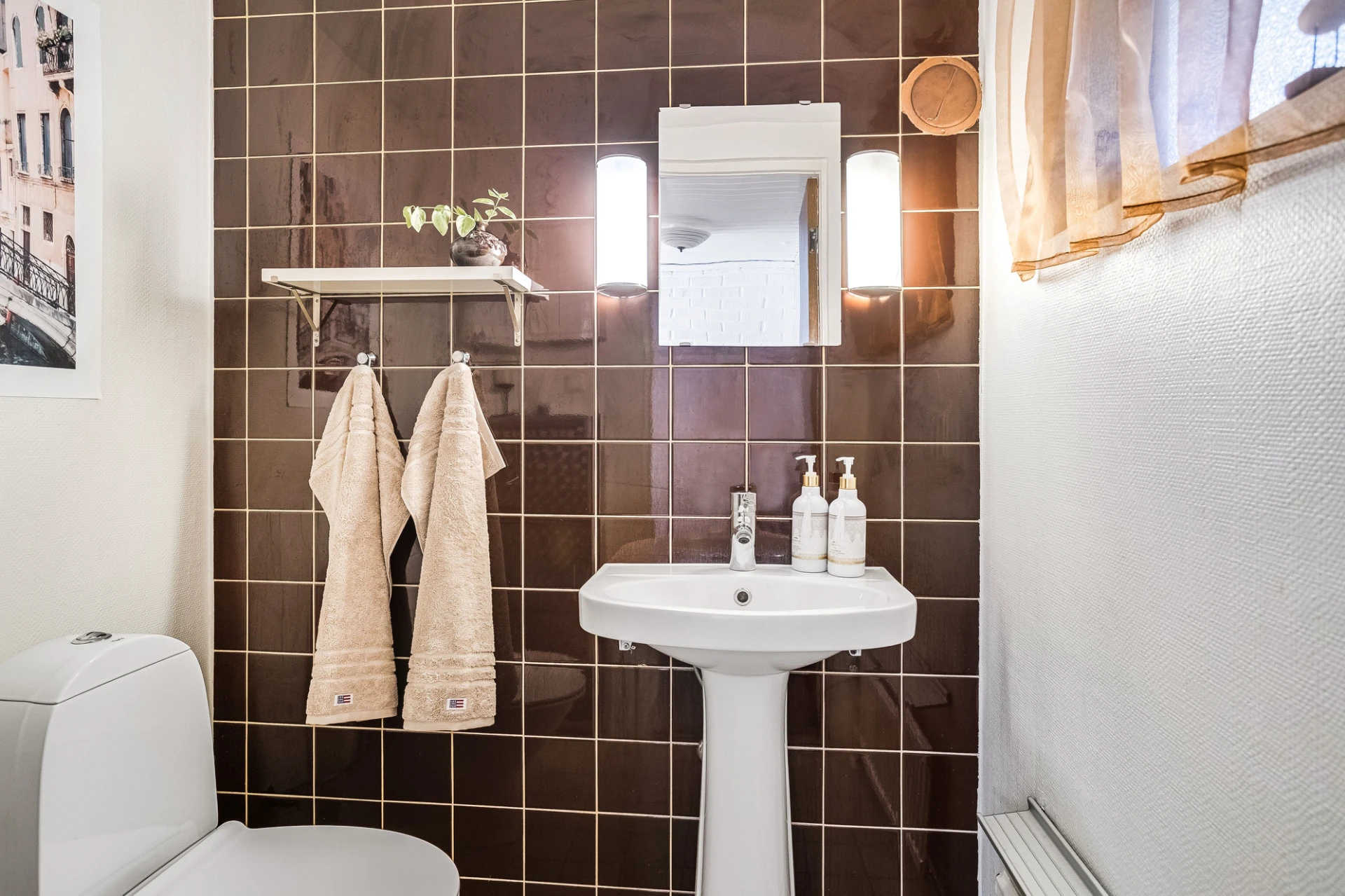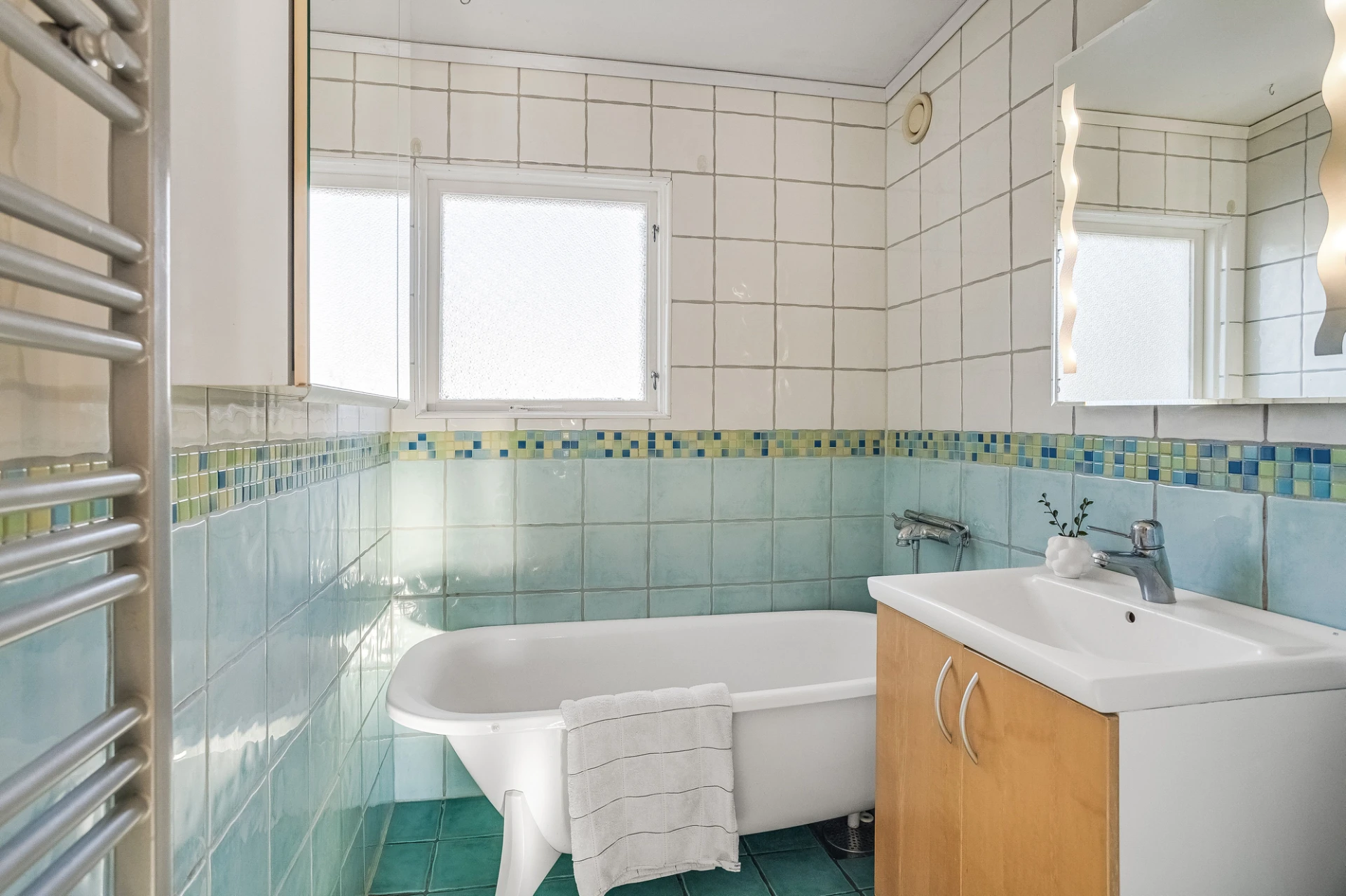 2003 - Badrum renoverat på övre plan, toastol, handfat, klinker, värmeslingor i golv, handdukstork, skåp.