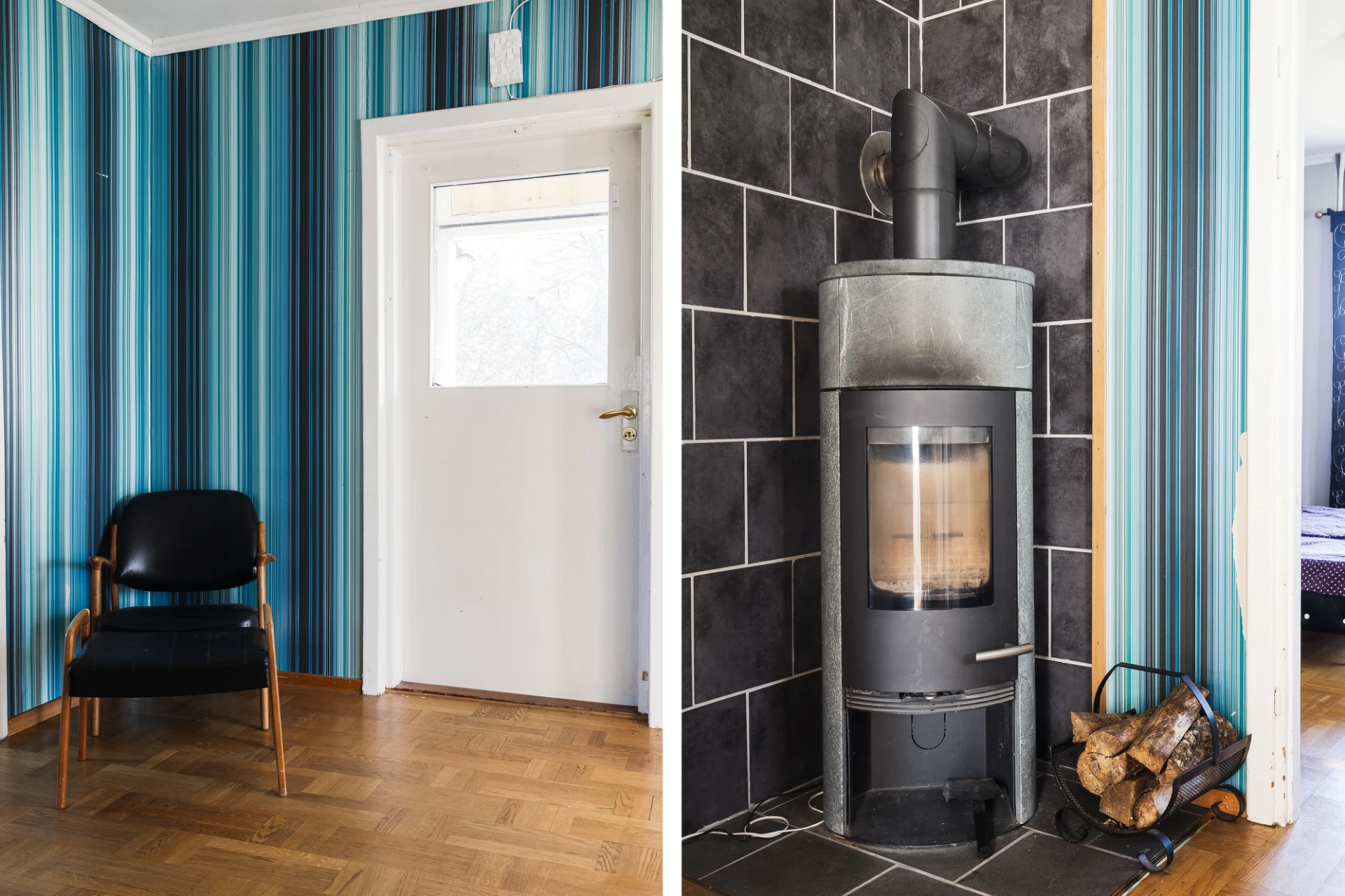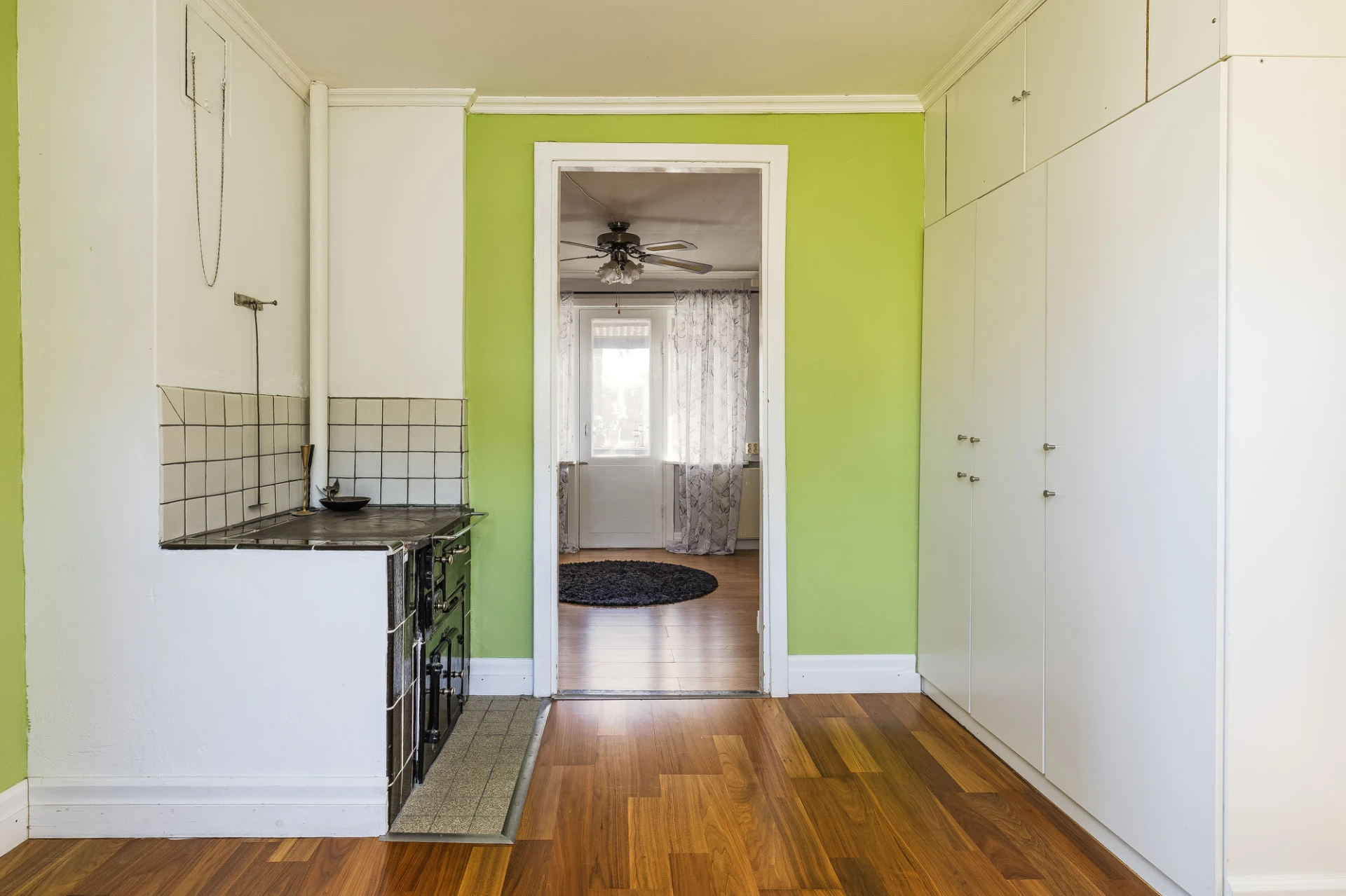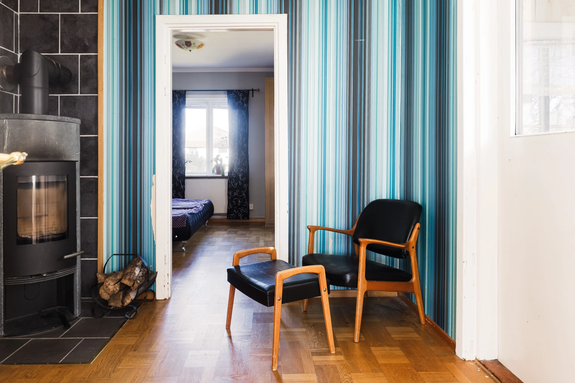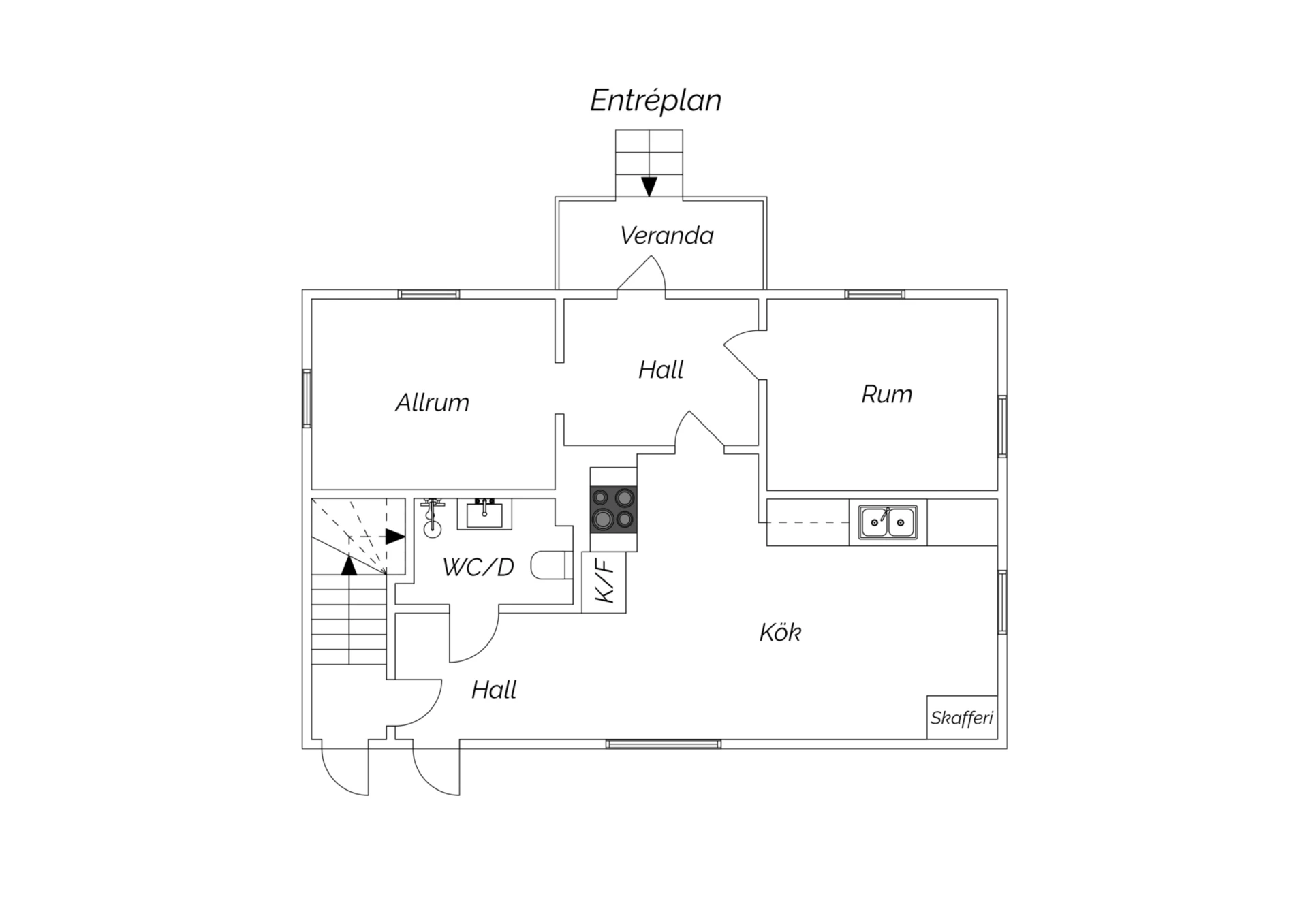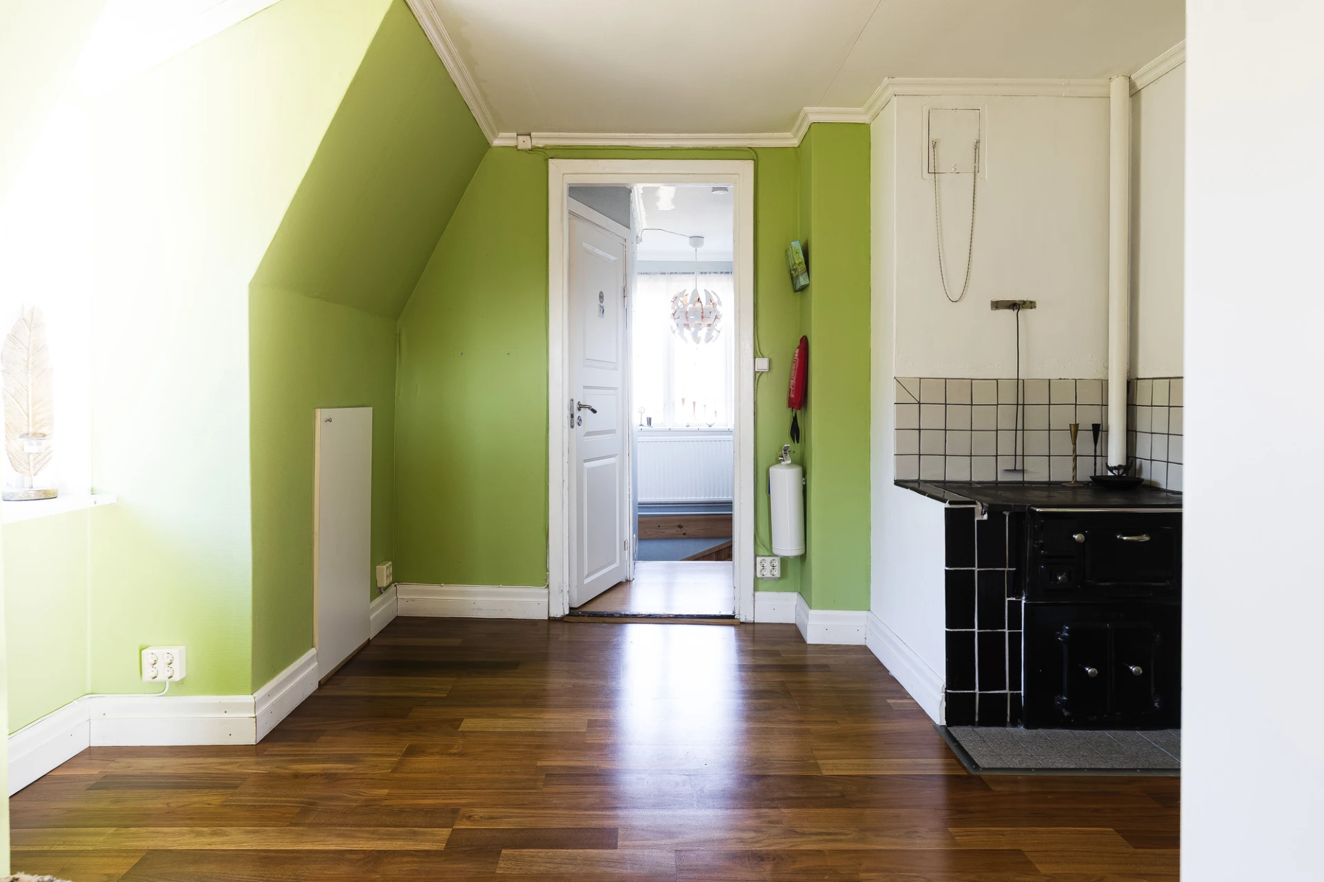 Med central belägenhet finns ett allrum med fullt fungerande vedspis, perfekt vid tillfällen så som elavbrott eller liknande. Förr var detta ett flerfamiljshus, därav att denna fina vedspis finns kvar och belägen på detta plan. Här finns också gott om förvaringsutrymmen.