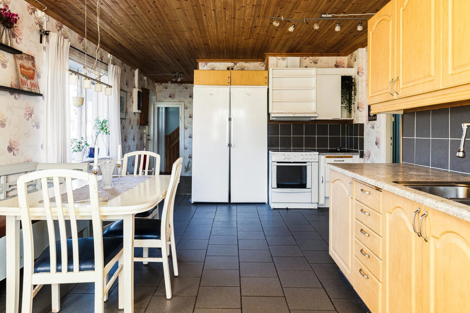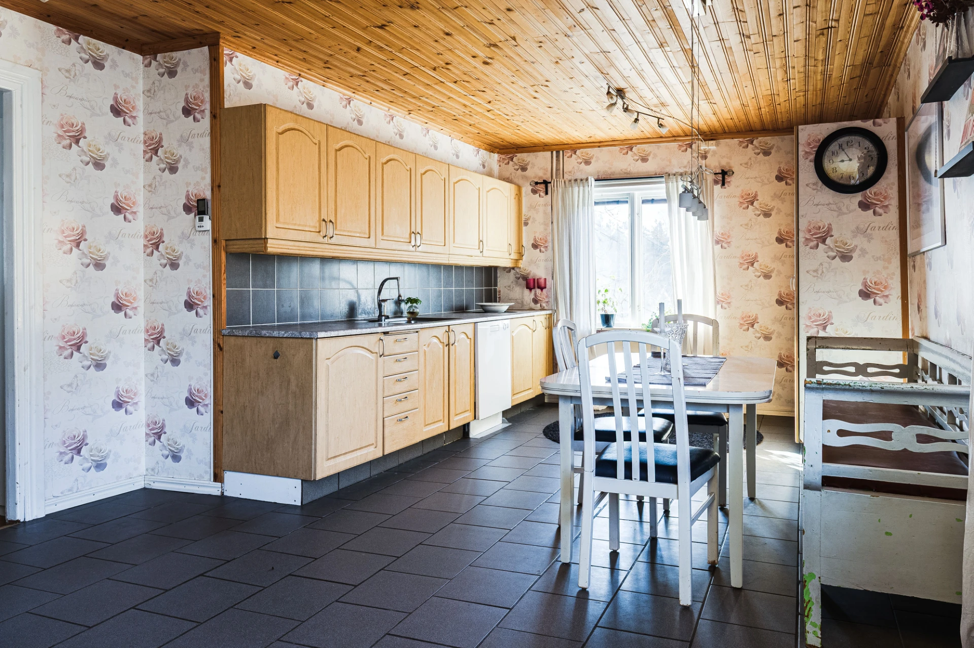 Stort och rymligt kök med gott om plats för både matlagning och sociala tillställningar, en plats där både vänner och familj kan samlas. Praktiskt klinkergolv även här. Gott om arbetsytor samt förvaringsmöjligheter. Spis, kul och frys samt diskmaskin är delar av utrustning som gör vardagen lättsamt.