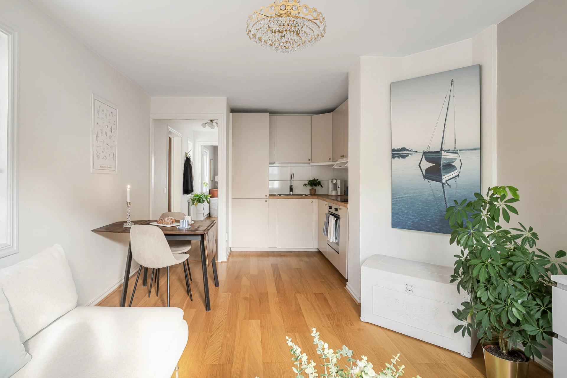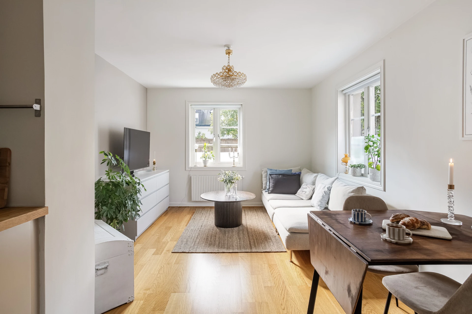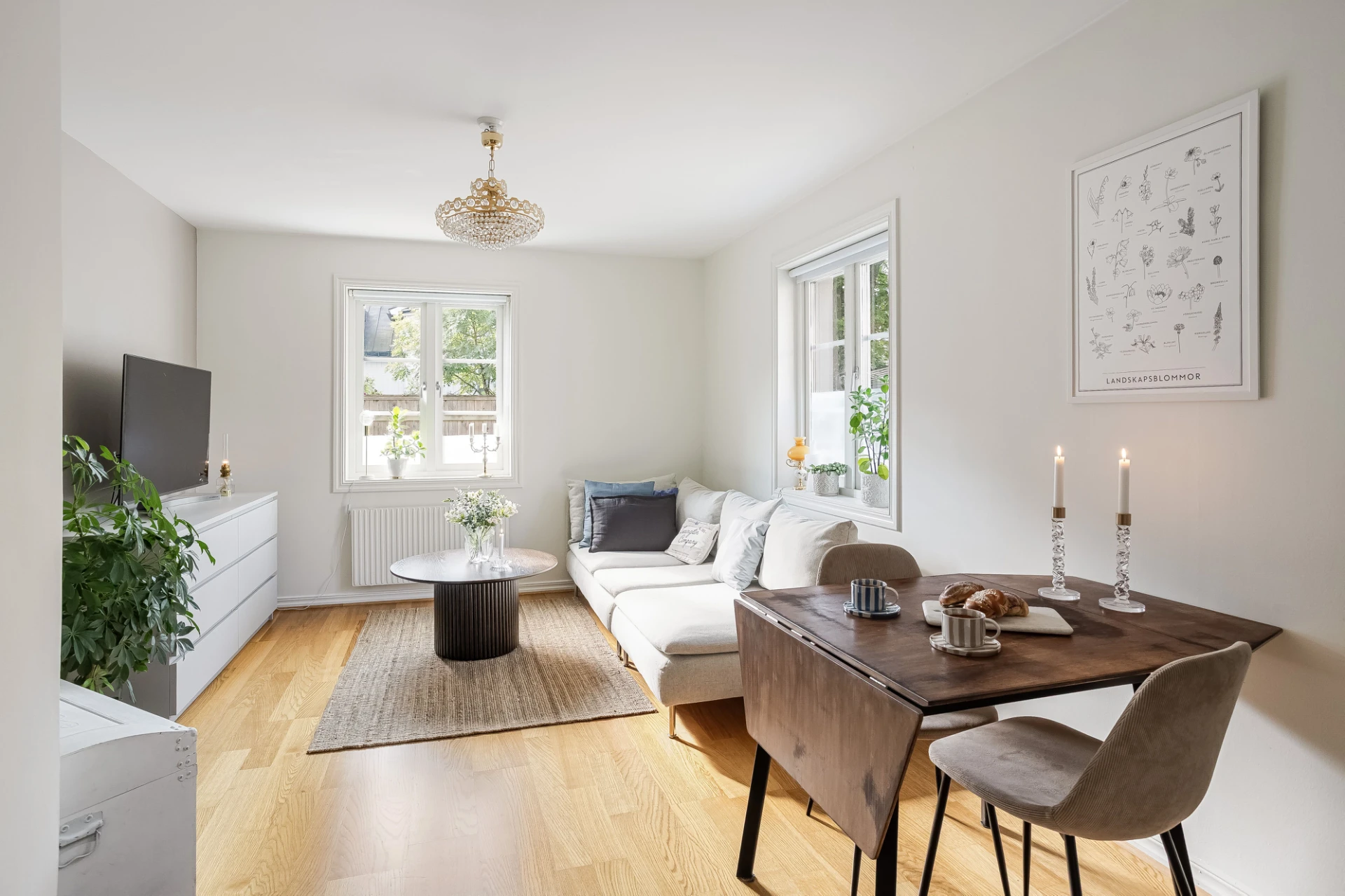Ljust och trivsamt vardagsrum med öppen planlösning mot köket och underbart ljusinsläpp från fönster i två väderstreck.