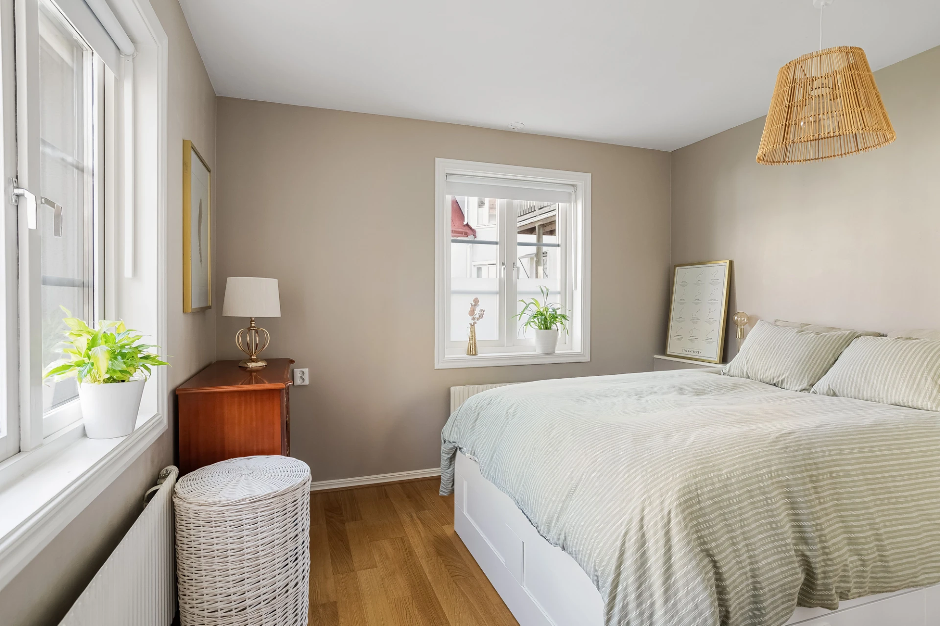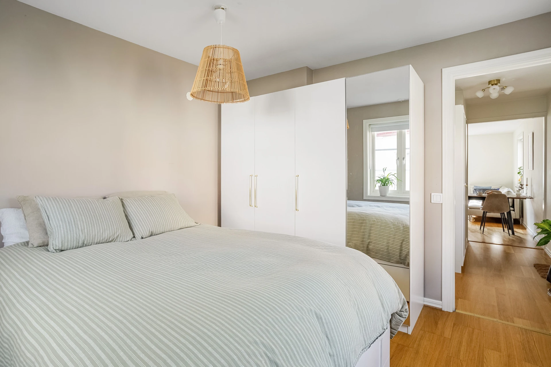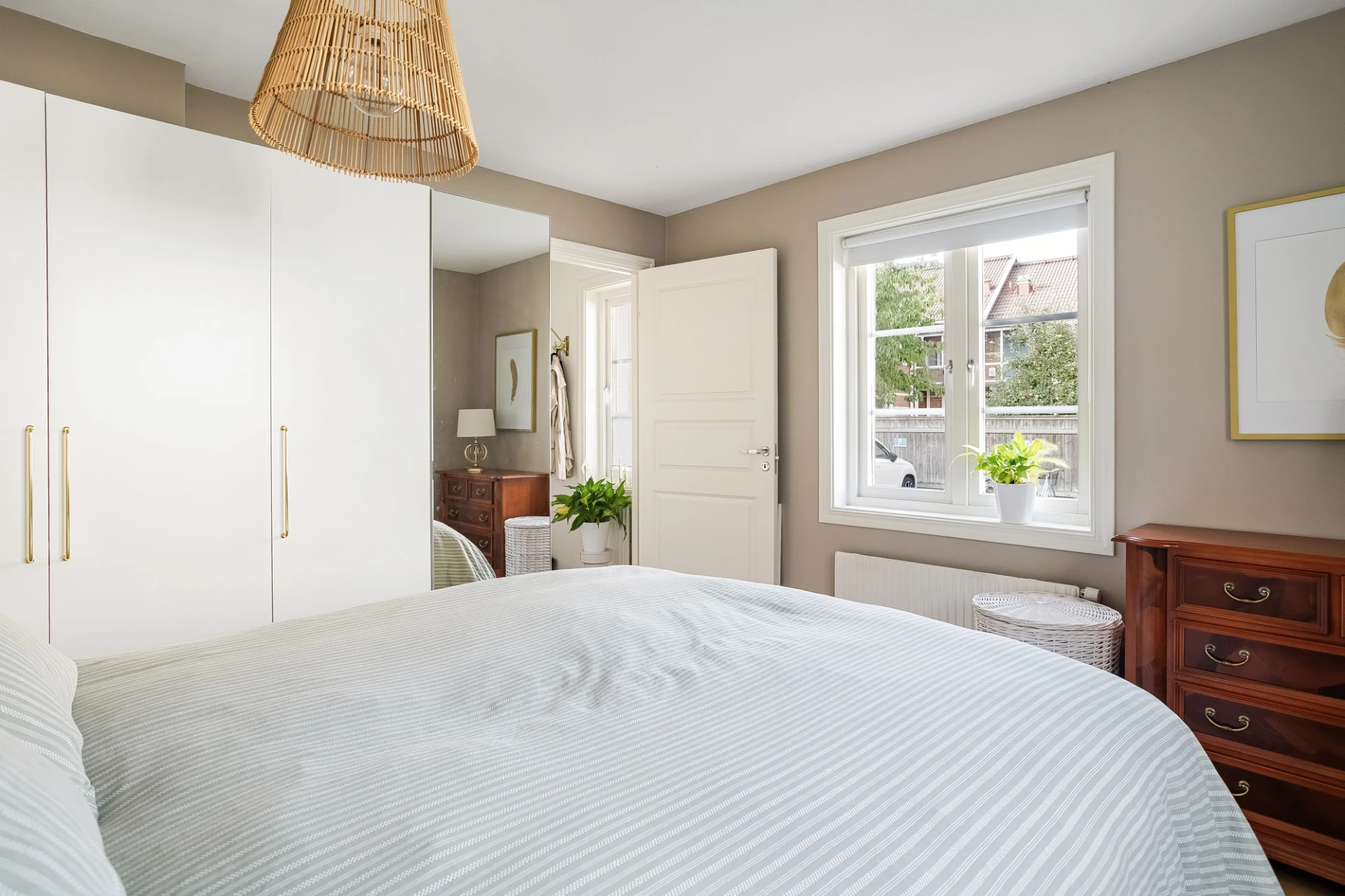 Till vänster om entrén ligger sovrummet. Rymligt och med härligt ljusinsläpp från fönster i två väderstreck. Kläderna får lätt plats i fyra garderober.