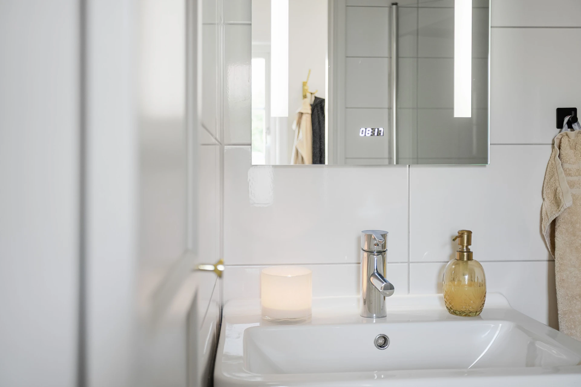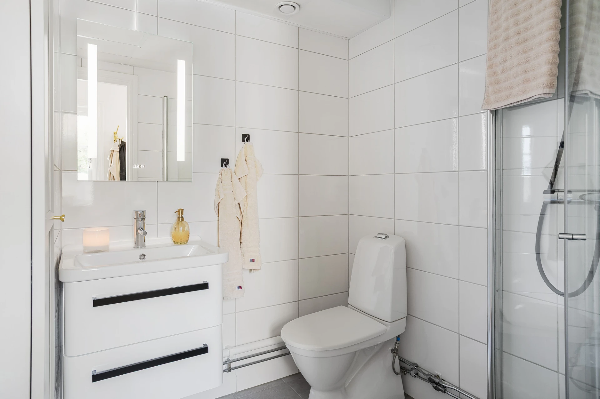 Stilren, helkaklad dusch/WC med wc, handfat med kommod, spegelskåp, dusch och handdukstork.