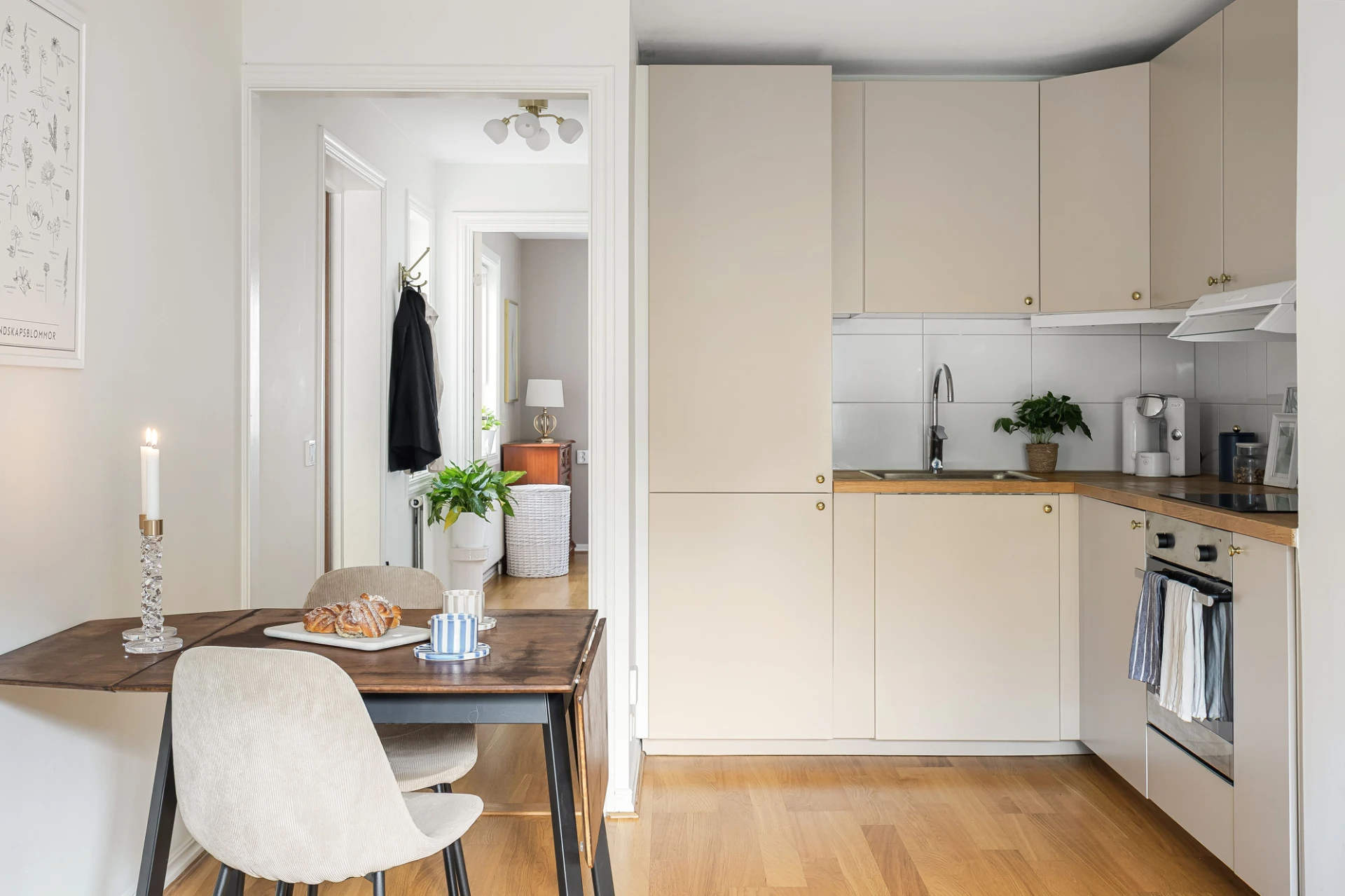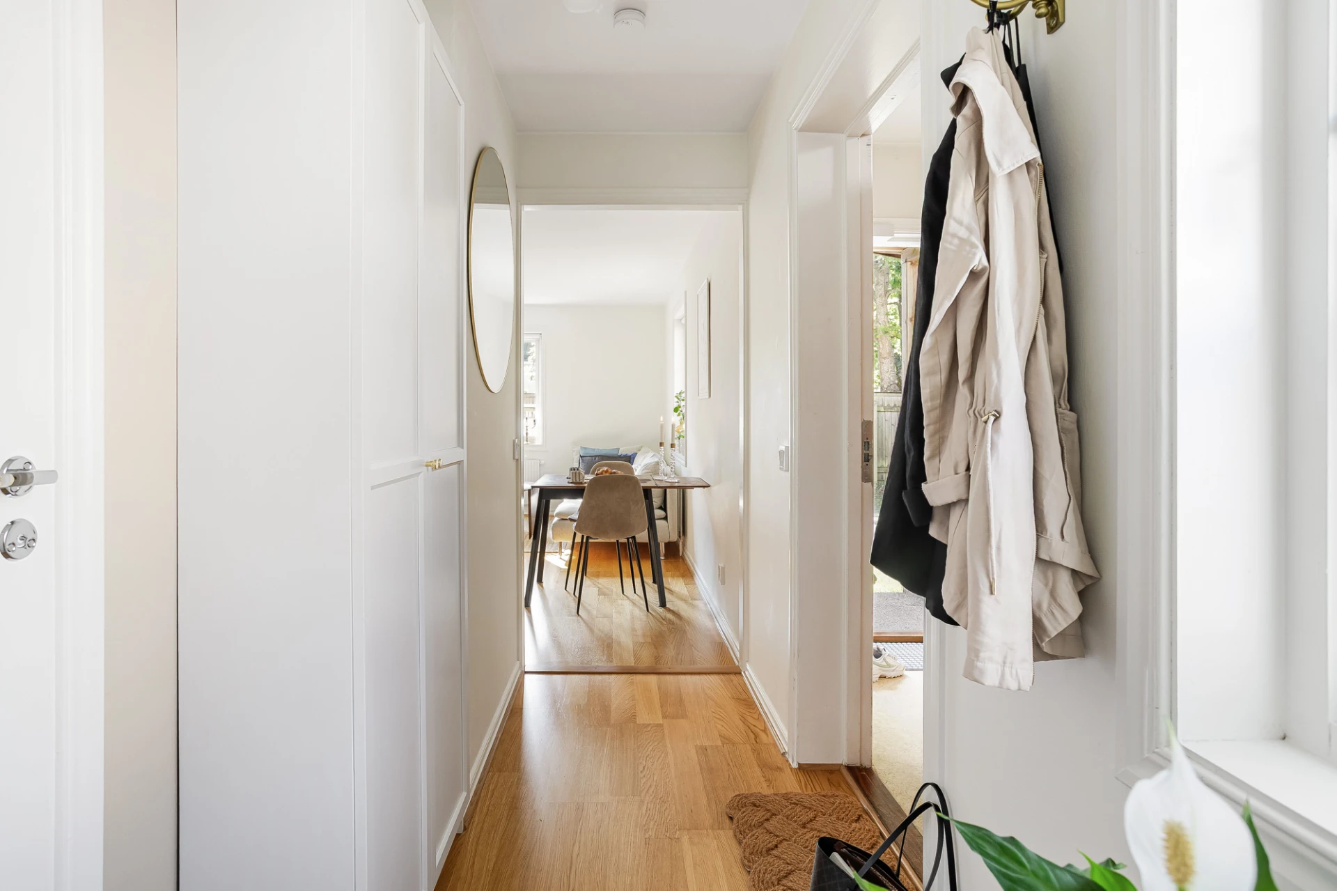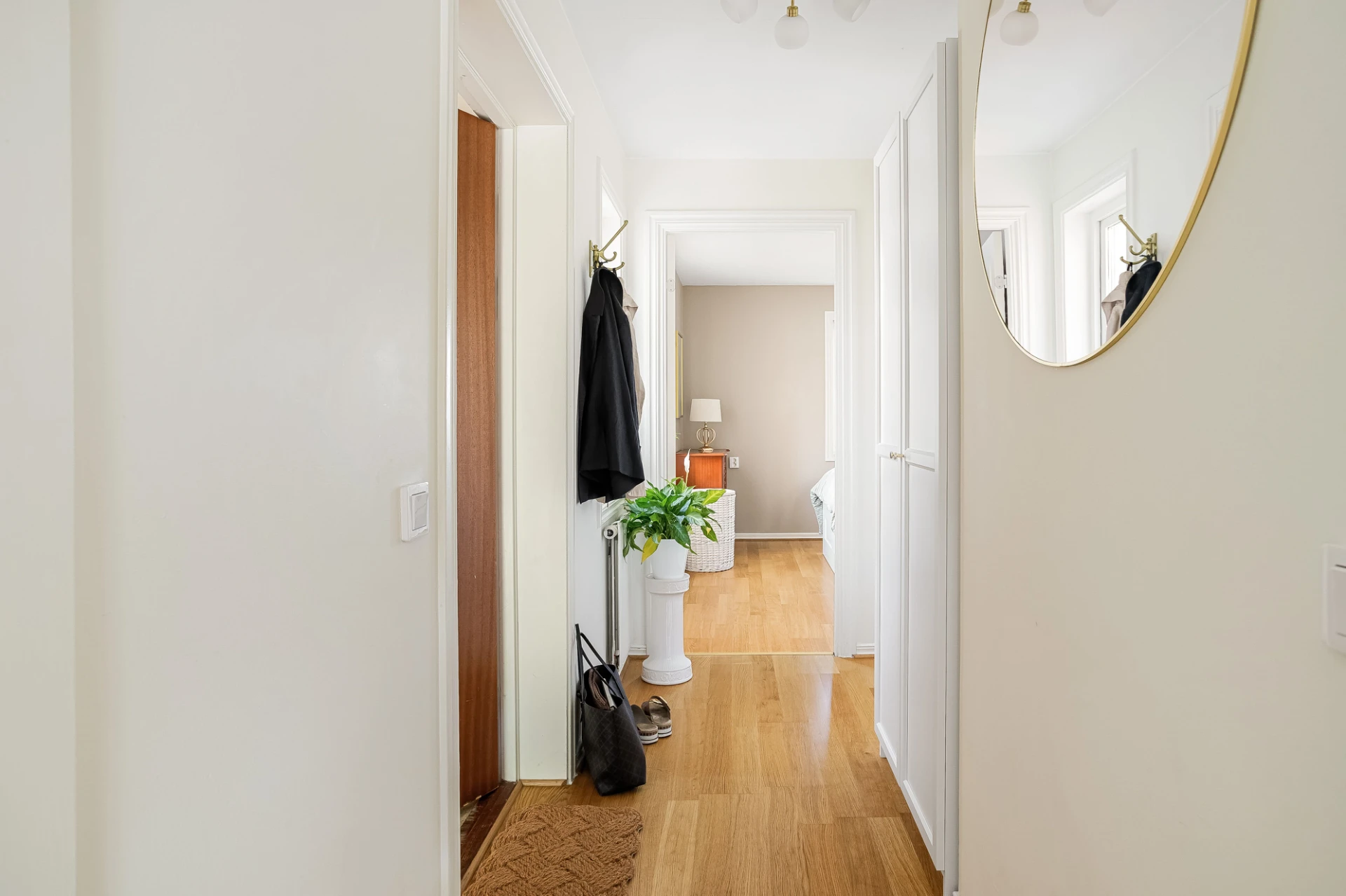 Inbjudande entré med avängningsmöjligheter i en garderob. På golvet ligger en ekparkett som enhetligt löper vidare i bostaden.