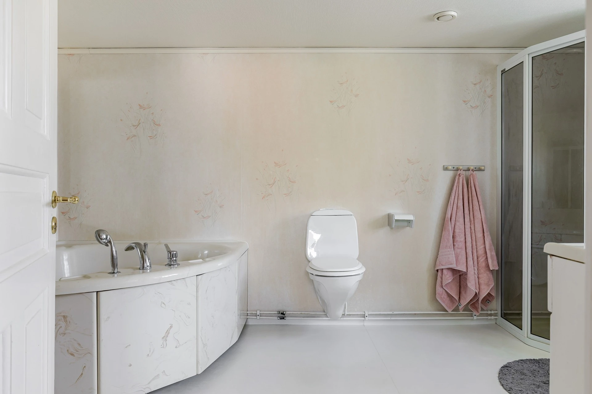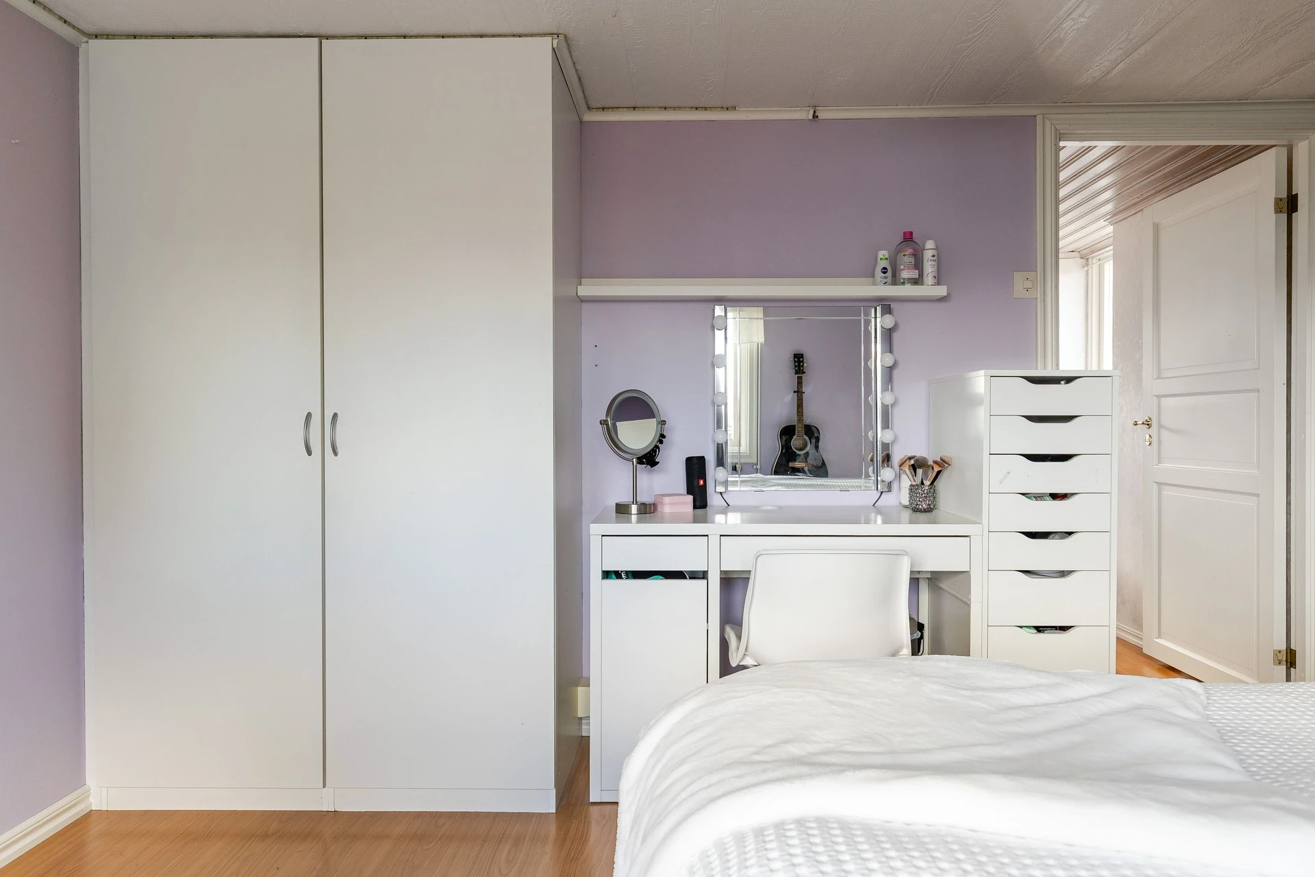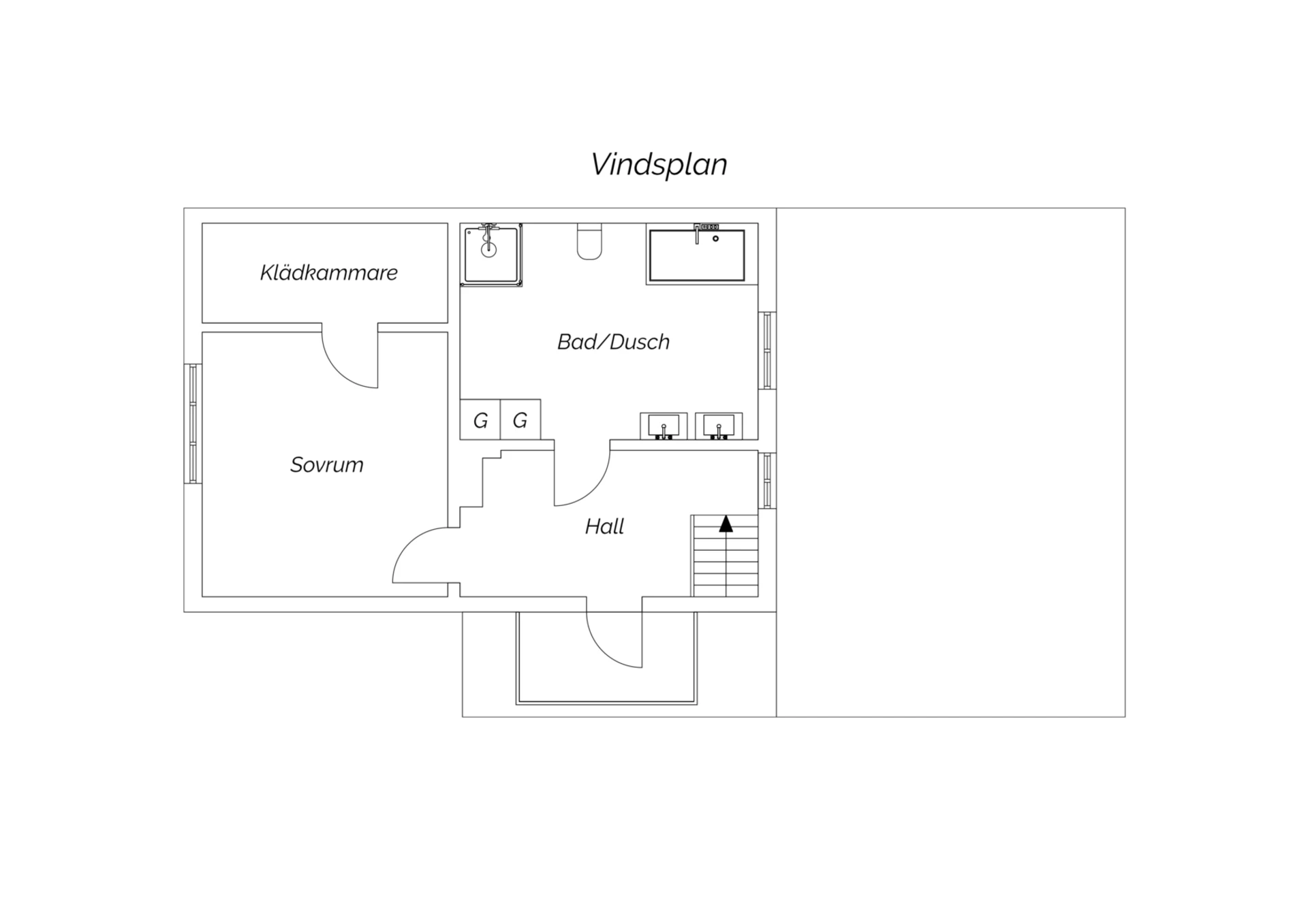 Här väntar ett stort badrum med både dusch och rymligt hörnbadkar. Här finns plats för bästa hemmaspa! Ett sovrum finns med egen walk-in-closet (eller barnens gömställe?) och en stor hall som fungerar utmärkt som kontor, pysselhörna eller kanske yogaplats.