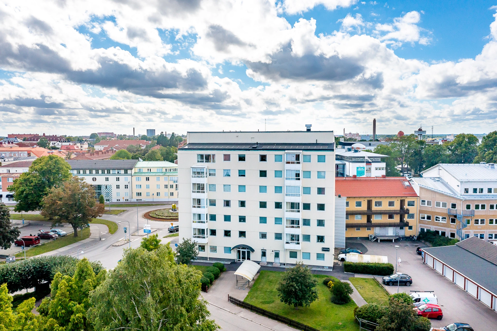 Högst upp i huset, på våning sju av sju, ligger denna trivsamma bostad om 91 kvm. Hissen tar er bekvämt till lägenheten som ursprungligen är en fyra men som disponerats om till en trea med ett stort matrum intill det välutrustade köket. De båda sovrummen är väl tilltagna och till det ljusa vardagsrummet hör en inglasad balkong i utmärkt västerläge med eftermiddags- och kvällssol. Balkongen används i princip under hela året som ett extra rum och bjuder på vidsträckt utsikt med vackra solnedgångar! I lägenheten finns såväl gästtoalett som helkaklat duschrum med egen tvättmaskin. Förvaringsmöjligheterna är goda i flertalet garderober, två klädkammare och både vinds- och matkällarförråd.