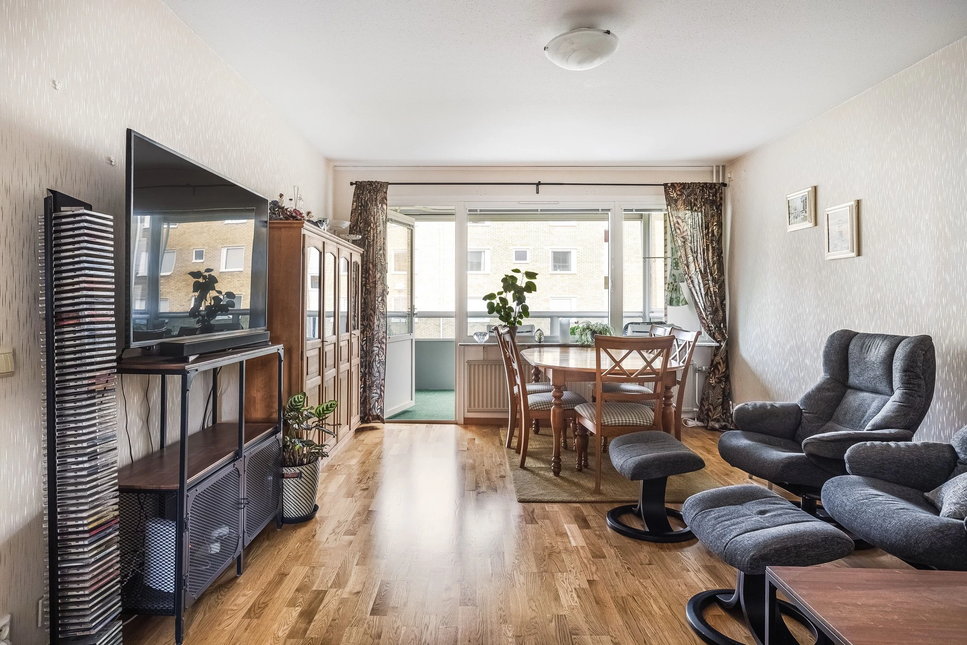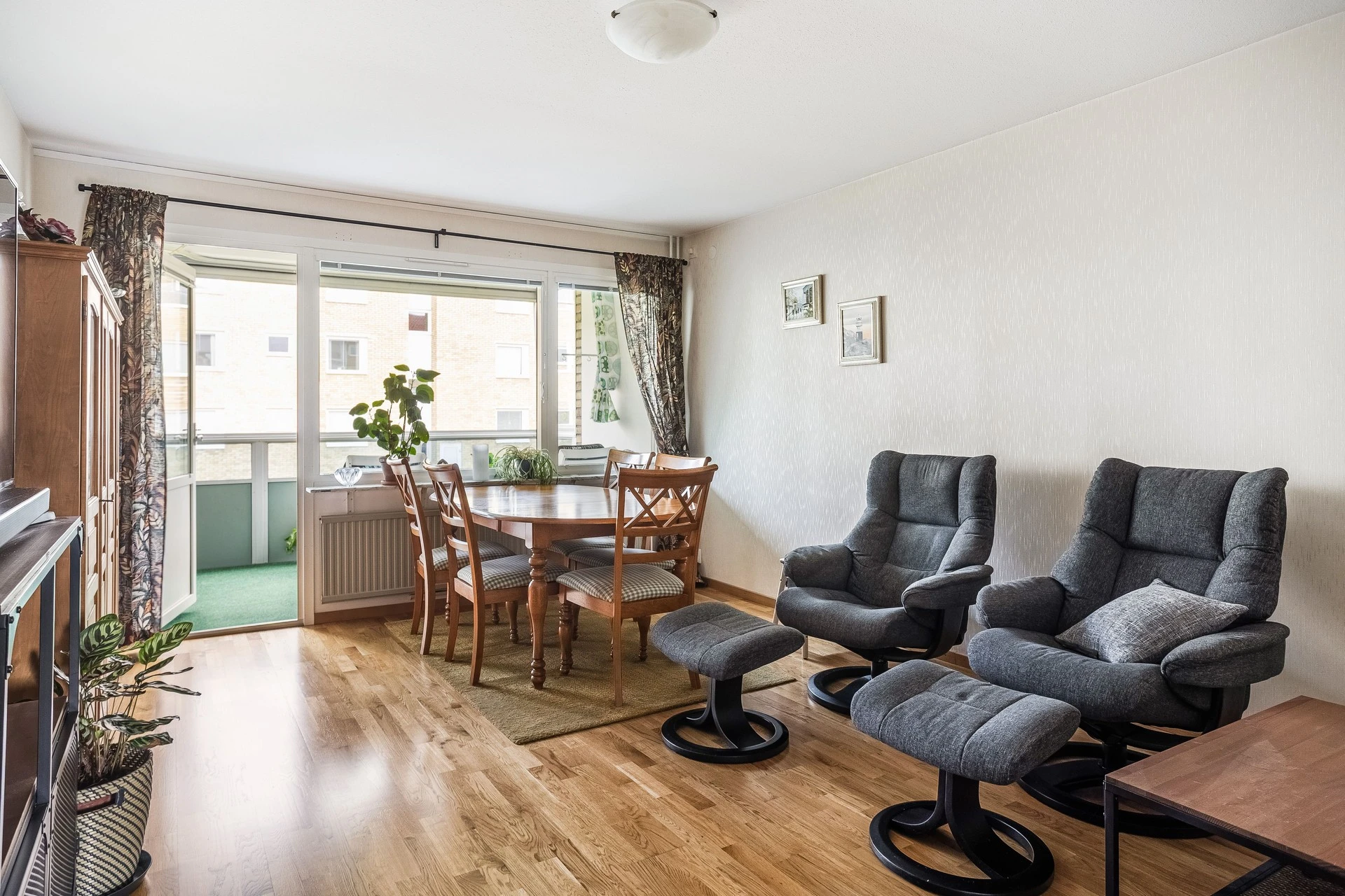 Rymligt och luftigt vardagsrum med parkettgolv. Här har man generöst ljusinsläpp från stora fönsterpartier och balkong. Här har du inglasad balkong i fantastiskt västerläge där du får möjlighet att njuta av eftermiddags-och kvällssolen.