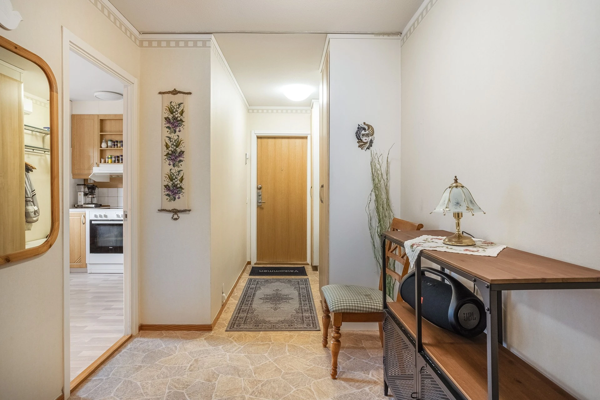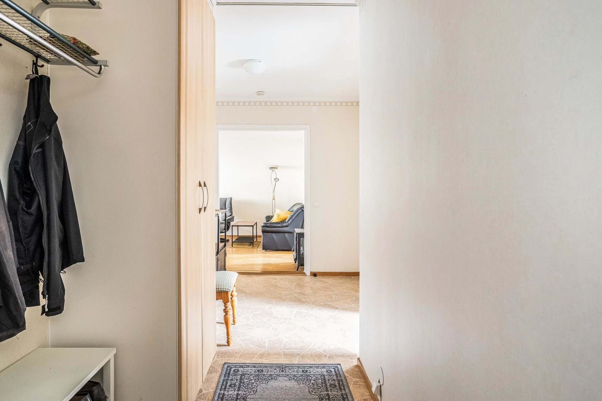 Hallen har gott om förvaring genom två rymliga garderober, dessutom bra med plats för avhängning av alla ytterkläder när familj och vänner är på besök.
