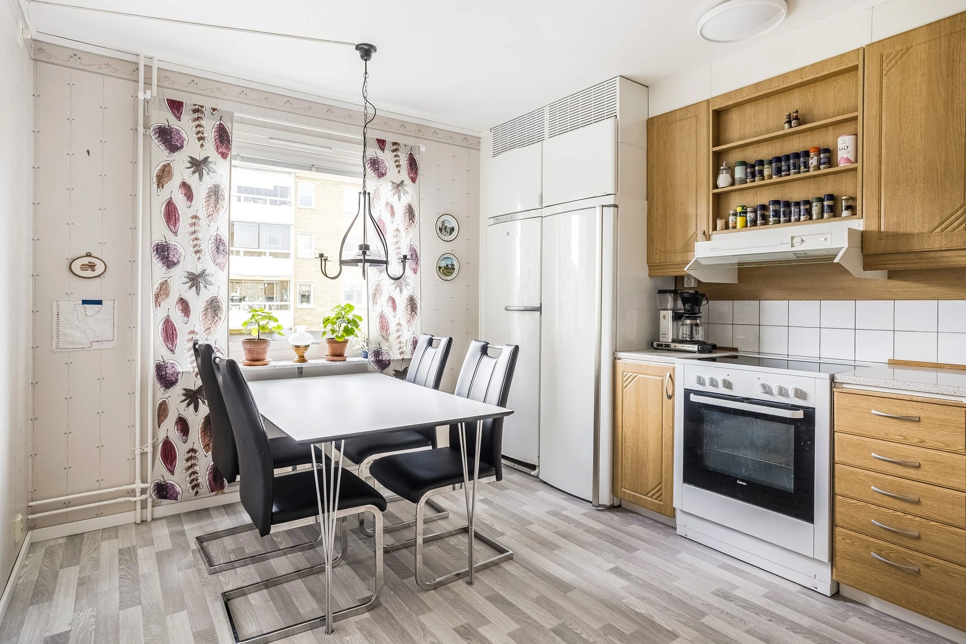 Köket är rejält och har bra med yta för matlagning och gott om förvaring. Här har man trevliga middagar vid matbordet intill fönster mot gården på framsidan.