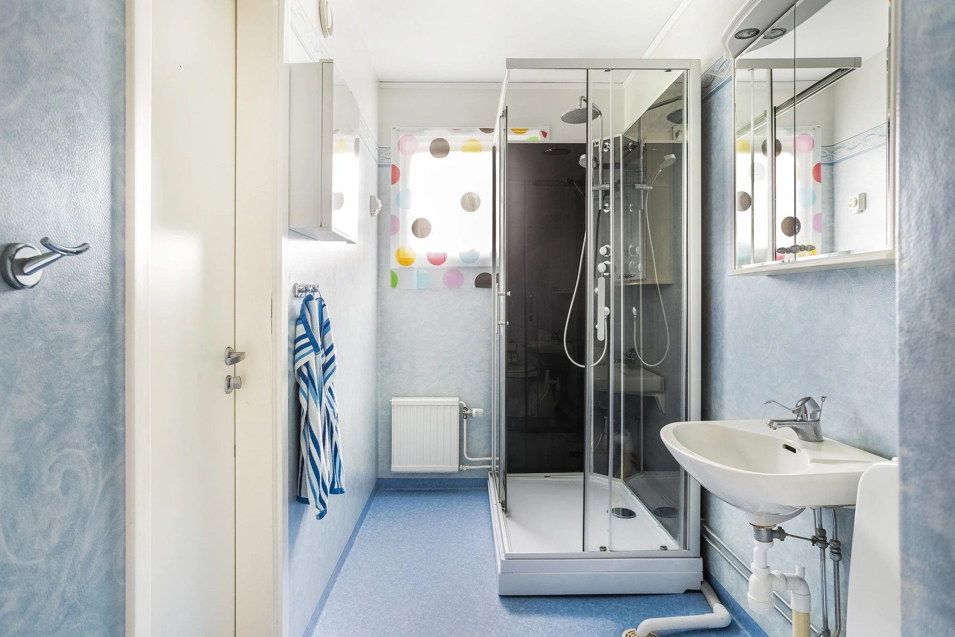 Badrummet har två praktiska ingångar, en direkt från sovrummet och en från hallen. Här finns det möjlighet att sätta in tvättmaskin ifall så önskas.