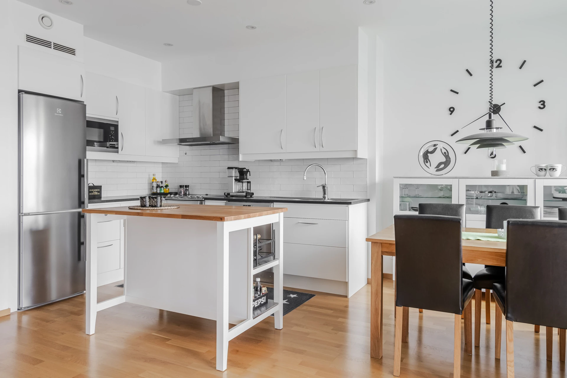 Till höger ges en ljus och öppen planlösning mellan kök och vardagsrum/allrum, vilken skapar utrymme för flertal möblerbara möjligheter och ger plats för både matgrupp och soffgrupp. Nuvarande ägare har även plats för en fristående köksö och fortfarande finns gott om utrymme. Köket är modernt och erbjuder gott om arbetsytor och utrymme med förvaring. De stilrena valen ger en klassisk touch och gifter sig fint och följs genom hela bostaden. Ljusa väggar och parkettgolven i ek finns genomgående i kök och vardagsrum samt sovrum.