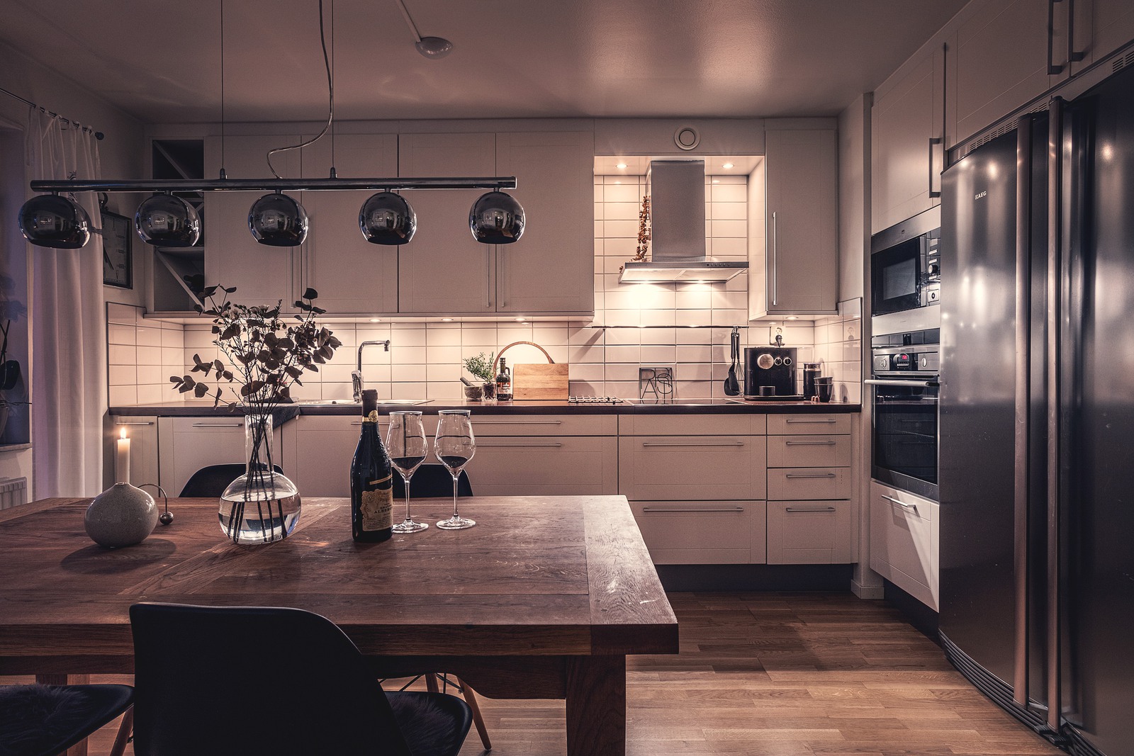 Ett kök behöver många olika sorters ljus – allmänbelysning, arbetsljus och stämningsljus. Dimbara spottar gör det enkelt att växla mellan arbets- och mysbelysning och takhängande armaturer över matbordet ger ett dekorativt ljus. Den sortens armaturer bör hänga 60–80 cm ovanför bordet för att undvika bländning. Vid arbetsytorna vill du inte ha lampor som ger skuggor, så välj gärna infällda spottar både i taket och som bänkbelysning. Se till att ljuset sprids jämnt över hela bänken och att allt ljus i köket har samma färgton – det ger bäst helhetskänsla!