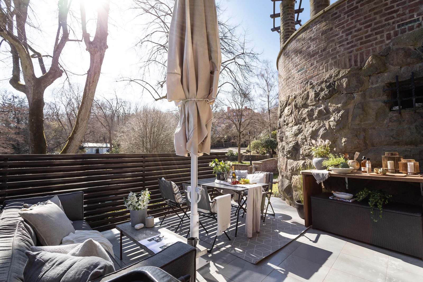 Två glasade franska dörrar öppnar upp mot en magisk terrass som bara väntar på sommarens långa ljumma utekvällar. Här finns gott om plats för utemöbler, grill och stora prunkande växter. Utsikten över grönskande Näckrosdammen är rogivande och föreningens gemensamma terrasserade trädgård för tankarna till Franska Rivieran.