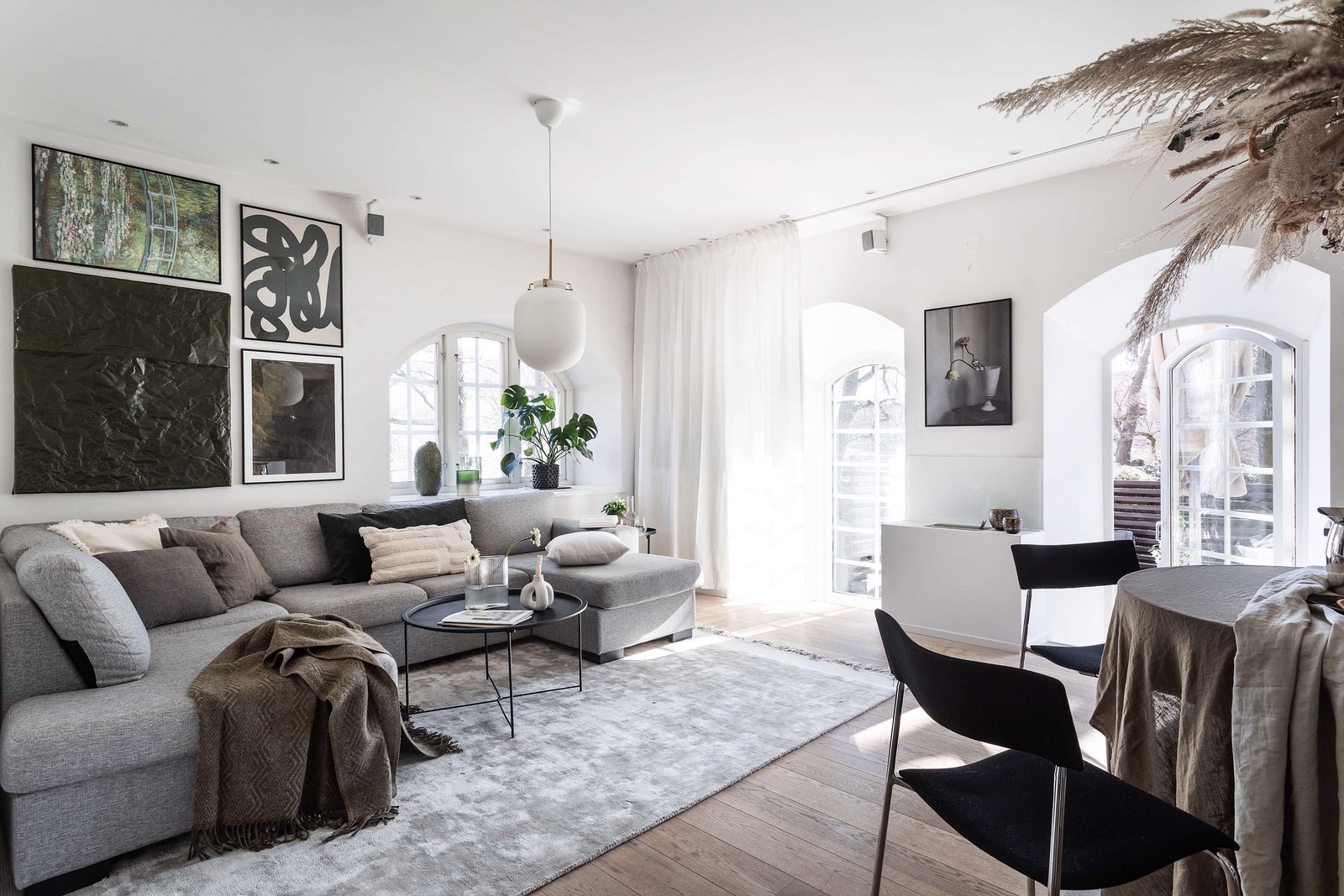 Lägenheten bjuder på en underbar sällskapsyta med vardagsrum och kök i öppen plan. En fantastisk eldstad utgör rummets naturliga medelpunkt och det fina parkettgolvet samt de djupa fönsternischerna skänker rummet karaktär.