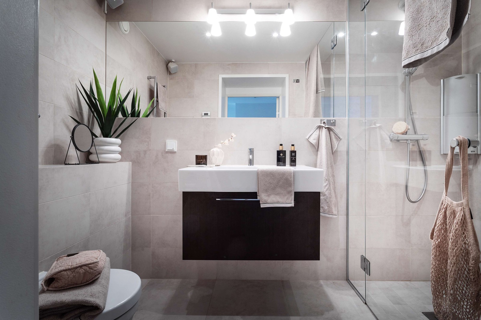 Lägenhetens badrum är stilrent, smakfullt och genomtänkt med vackra materialval, fantastisk dusch och sober SPA-känsla. Detta vackra hem bjuder dessutom på platsbyggd förvaring, tvättutrustning och ett mjukt ljus från infälld belysning.