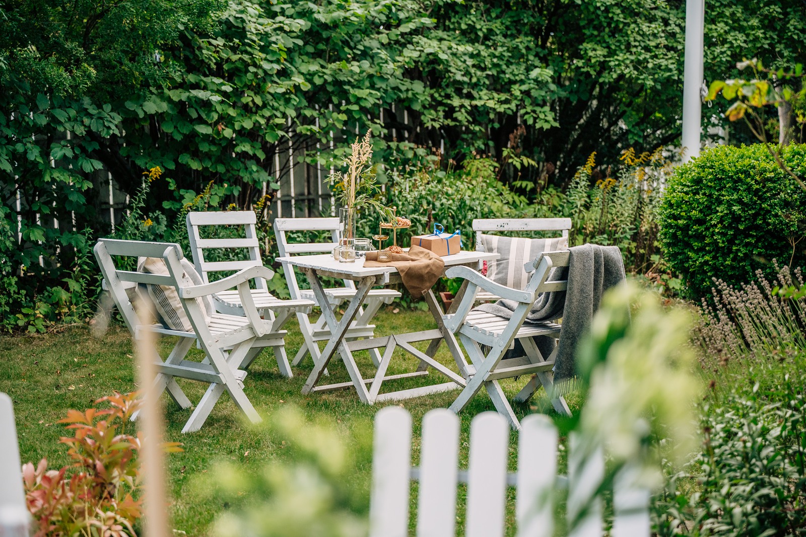 En charmig grind och en oas av grönska välkomnar dig på väg fram till huset. I den insynsskyddade trädgården finns det flera ytor att slå sig ned på för att en fika tillsamman med vänner och familj. Trädgården bjuder bland annat på buxbom, syrener, pioner, hallonbuskar, äppel- och päronträd.