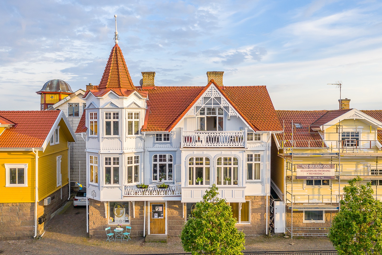 Huset har en iögonfallande fasad med fantastisk snickarglädje och med en lång och fin historia. Bara stommen till huset tog tio år att timra för att sedan fraktas med häst och vagn och därefter via segelskuta från Norrland till Smögen.
