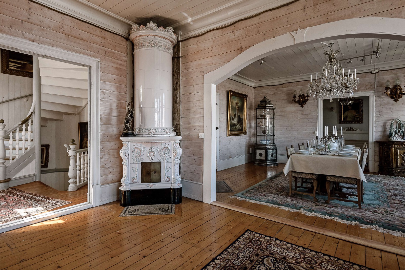 I hemmet har man låtit bevara originalkaraktären så långt det är möjligt. Vackra munblåsta fönster, massiva furugolv, glasveranda, representativa rum, tinnar & torn, handmålad takmålning och inte minst – fem imponerande kakelugnar från Rörstrand 1890.