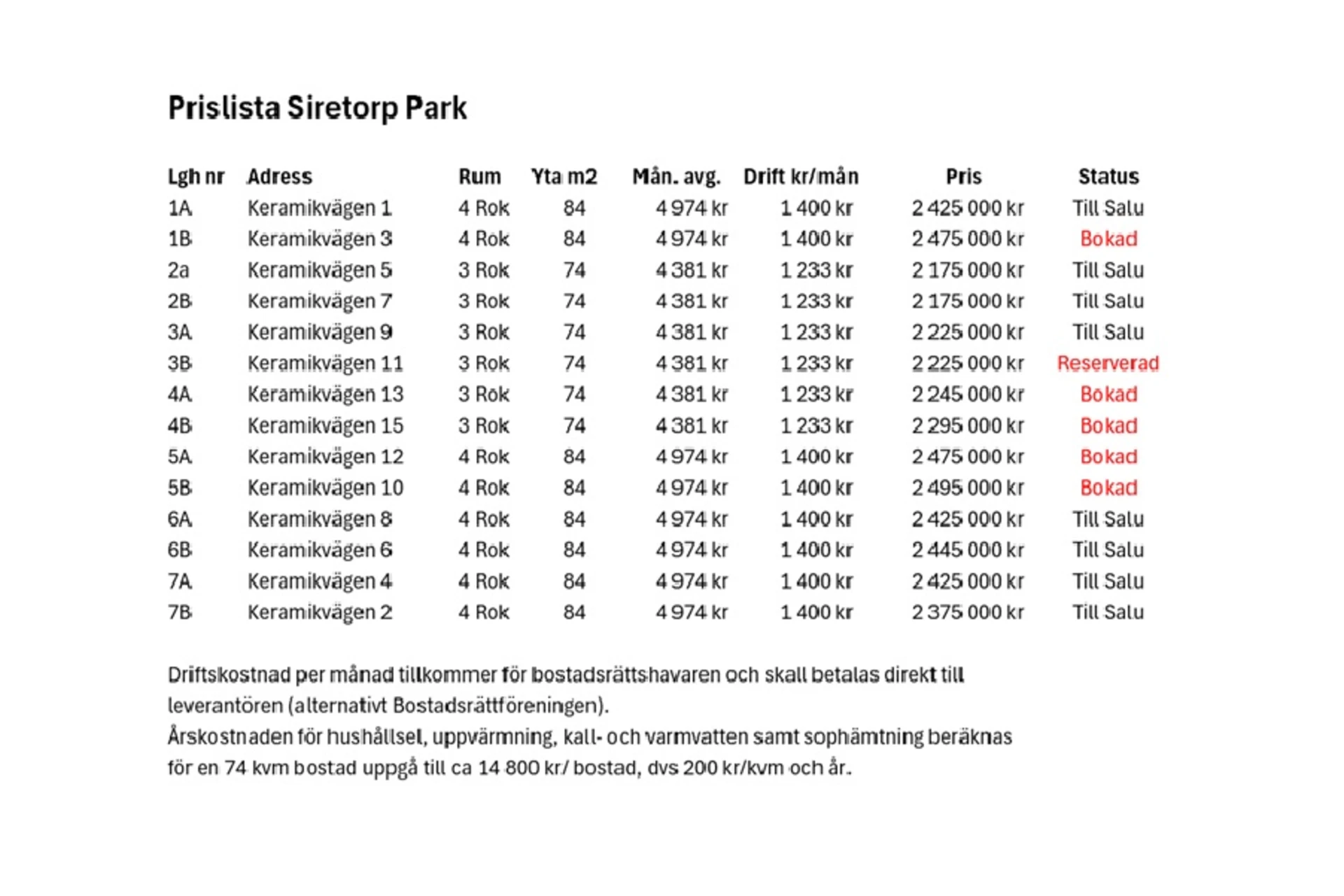 3 rok om 74 kvm kostar från 2 175 000 kr. Månadsavgiften är beräknad till 4 381 kr/mån med tillkommande driftskostnad om ca 1 233 kr/mån. I angiven driftskostnad ingår beräknad kostnad för värme, hushålls-el samt varm och kallvatten.